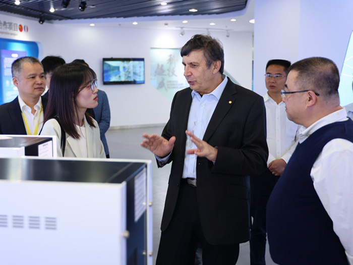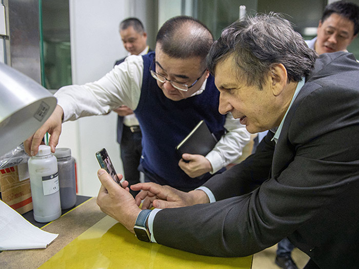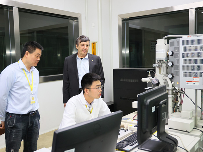 在科技中心,安德烈?海姆教授饒有興趣地參觀了超威科技項(xiàng)目研發(fā)實(shí)驗(yàn)室。當(dāng)看到石墨烯項(xiàng)目組研發(fā)人員正在進(jìn)行材料分析時(shí),他饒有興趣地拿起一瓶石墨烯材料仔細(xì)觀察,并與研發(fā)人員進(jìn)行相關(guān)技術(shù)問題。
